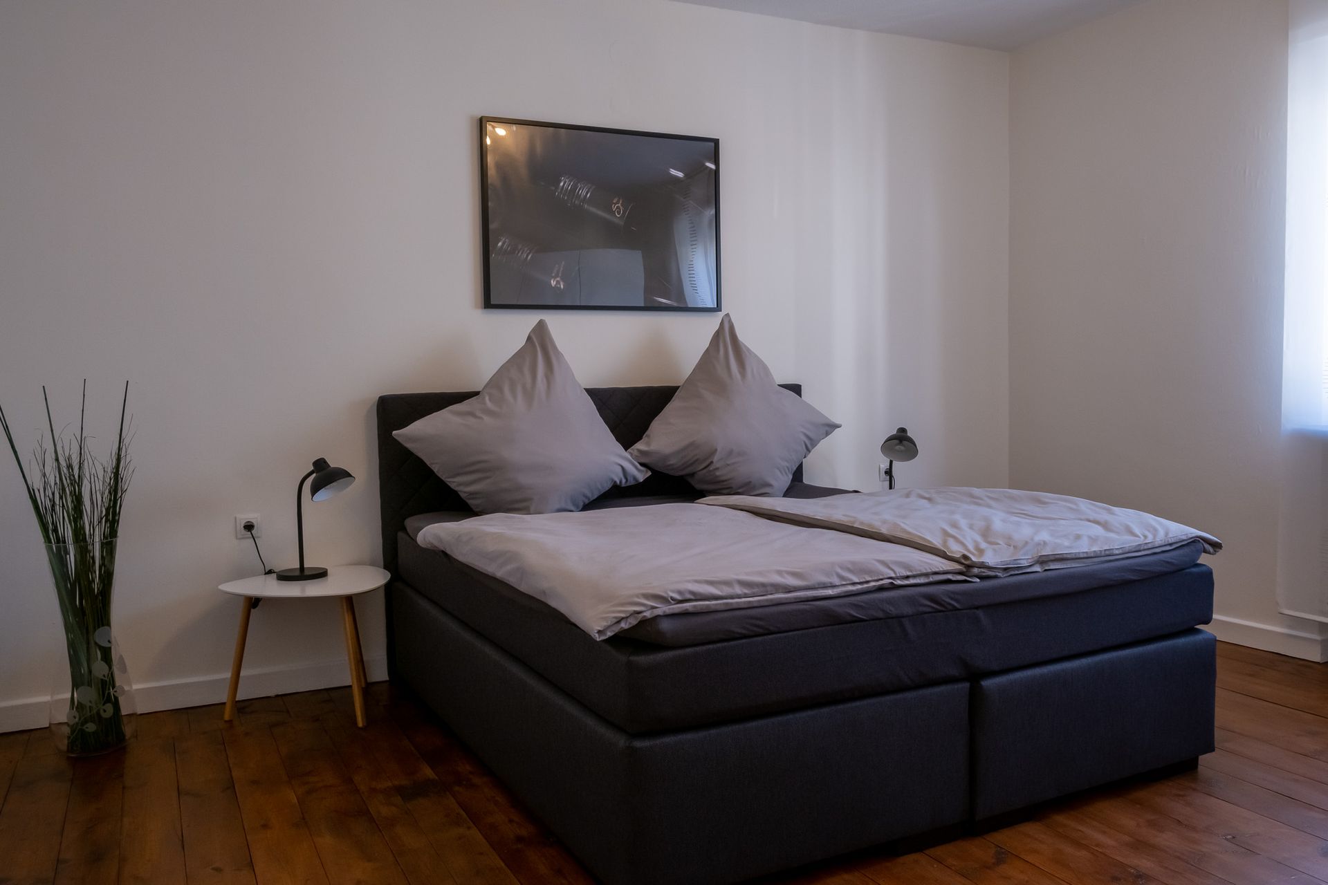 Die Wohnung verfügt über ein großzügiges Wohnzimmer, ein separates Schlafzimmer mit modernem Boxspringbett sowie eine voll ausgestattete Küche. Diese bietet alles, was Sie für Ihren Aufenthalt benötigen – vom Backofen über Spülmaschine und Kaffeemaschine bis hin zu einer praktischen Grundausstattung.